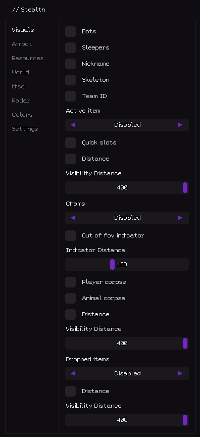 Visibility Distance (corpses) – Max corpse ESP range (0-400 m).